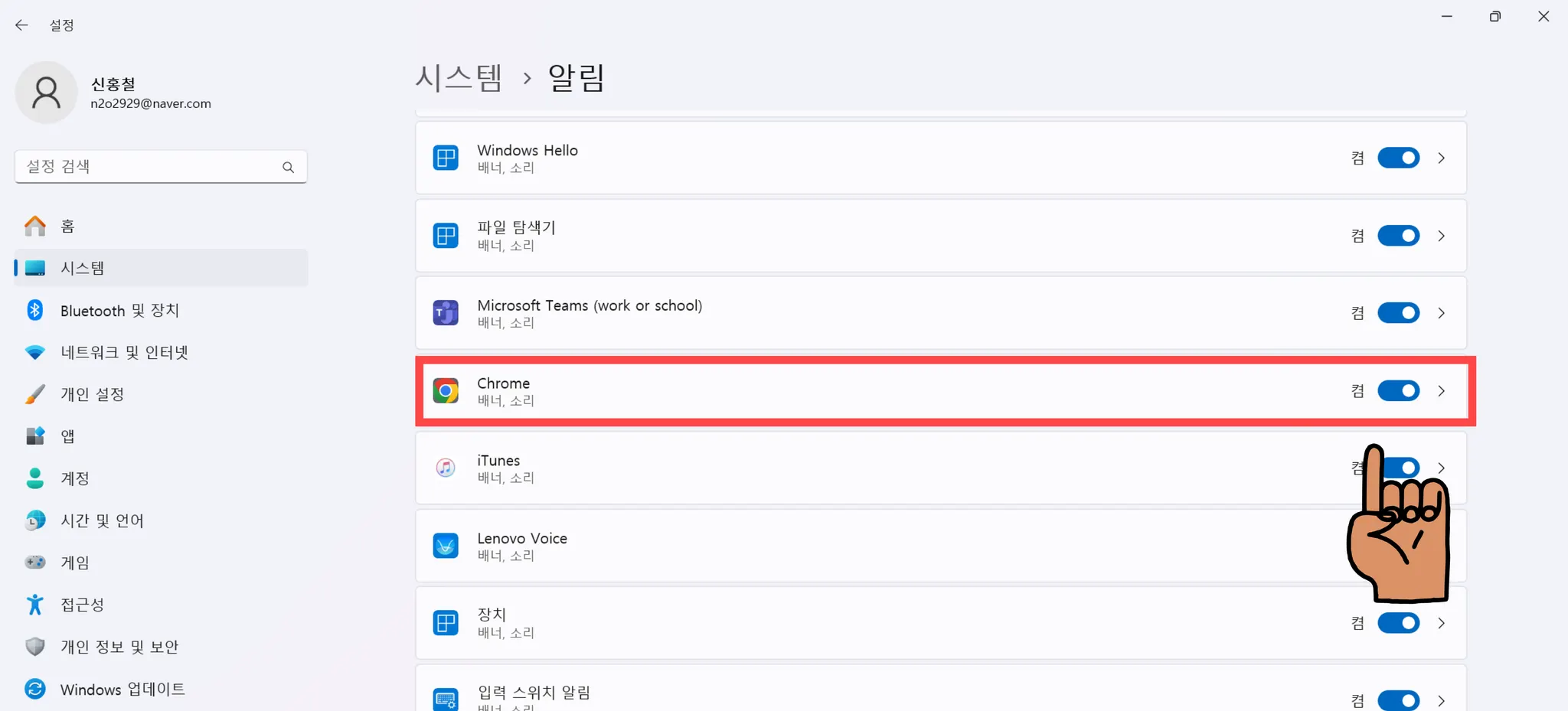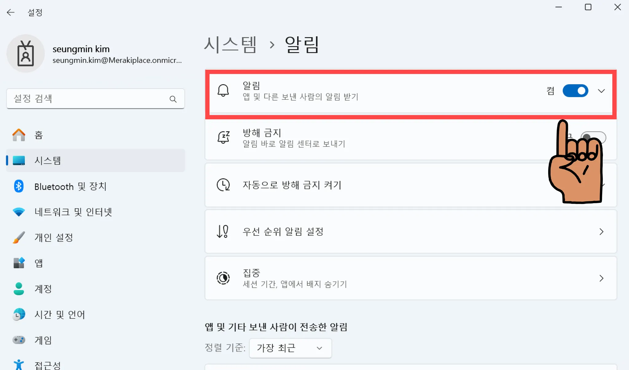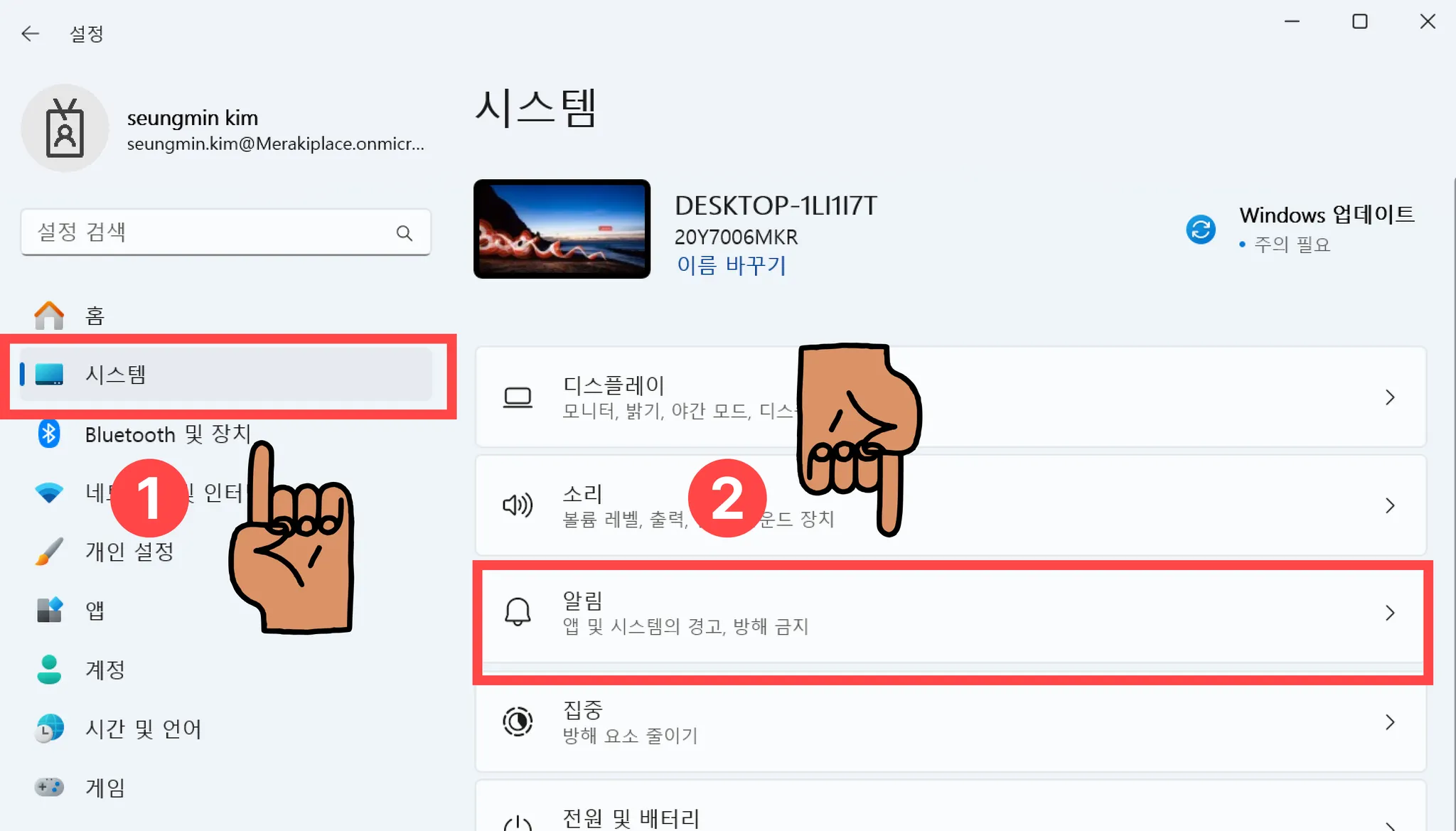 02. 좌측에 시스템 누르고, 우측에서 알림을 눌러주세요