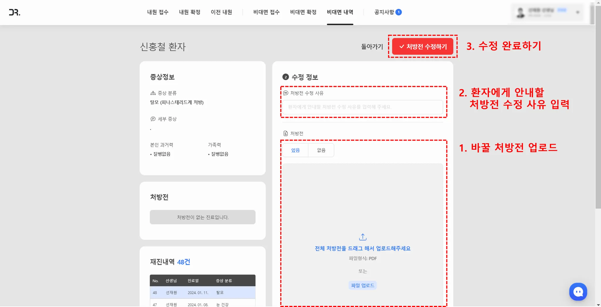 2. 새로운 처방전을 업로드하고, 환자에게 안내할 처방전 수정 사유를 입력하고 완료해 주세요!