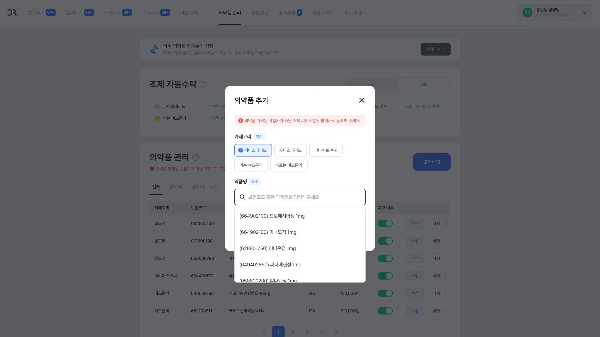 약품코드 또는 약품명을 검색하여 취급하는 의약품 모두 추가하기