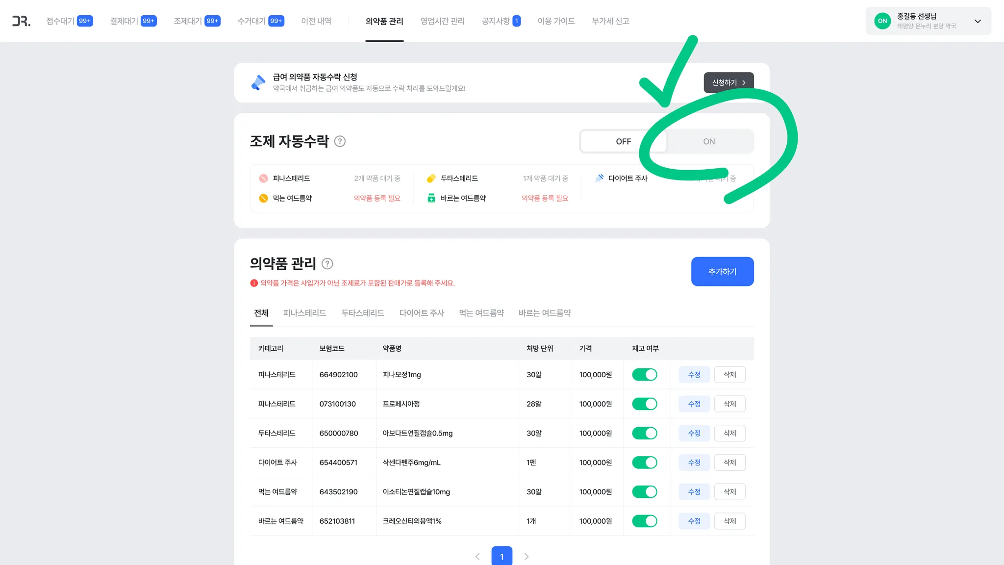 조제 자동수락 기능을 OFF 버튼으로 눌러주시면 돼요.