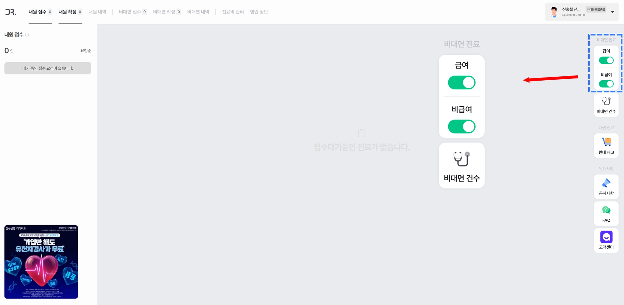 메인홈 우측 > 비대면 진료의 [급여/비급여] 운영 여부 관리