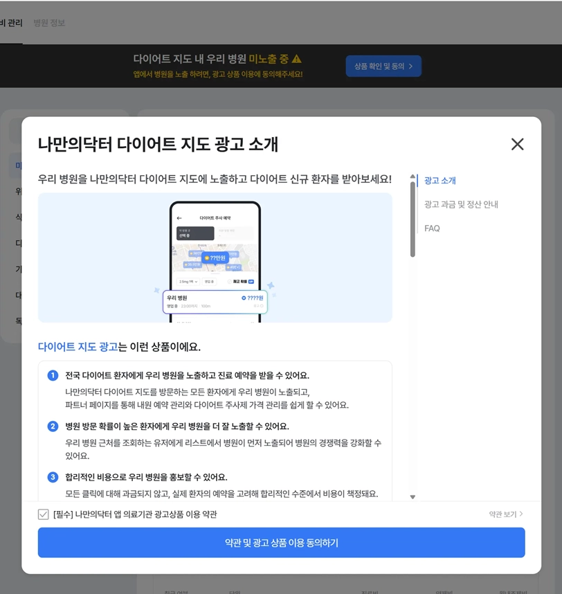 대면 다이어트 항목 노출 희망 시, 다이어트 지도 광고에 대한 약관 동의 및 광고 상품 동의가 필요합니다.