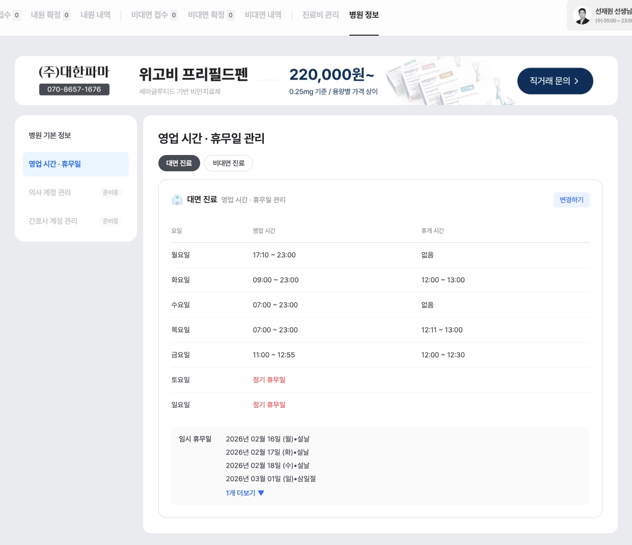 1. 비대면 진료와 대면진료를 분리하여 각각의 운영시간을 설정할 수 있어요.