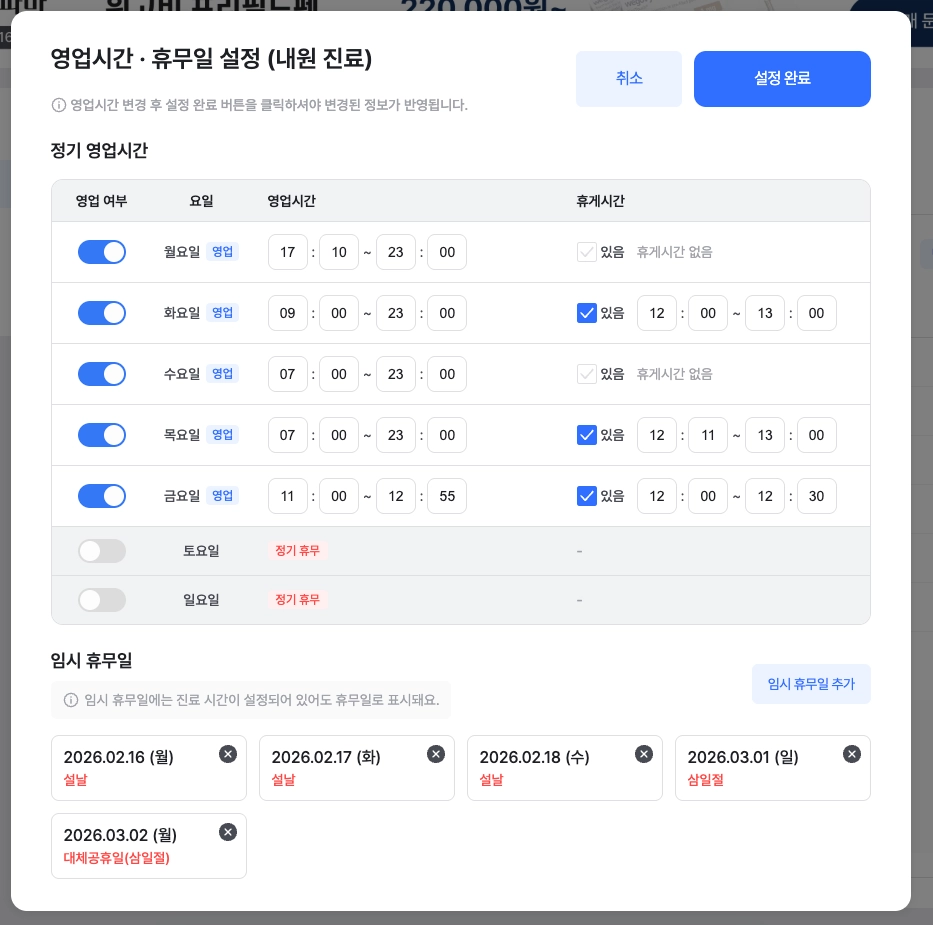 ‘임시 휴무일 등록’