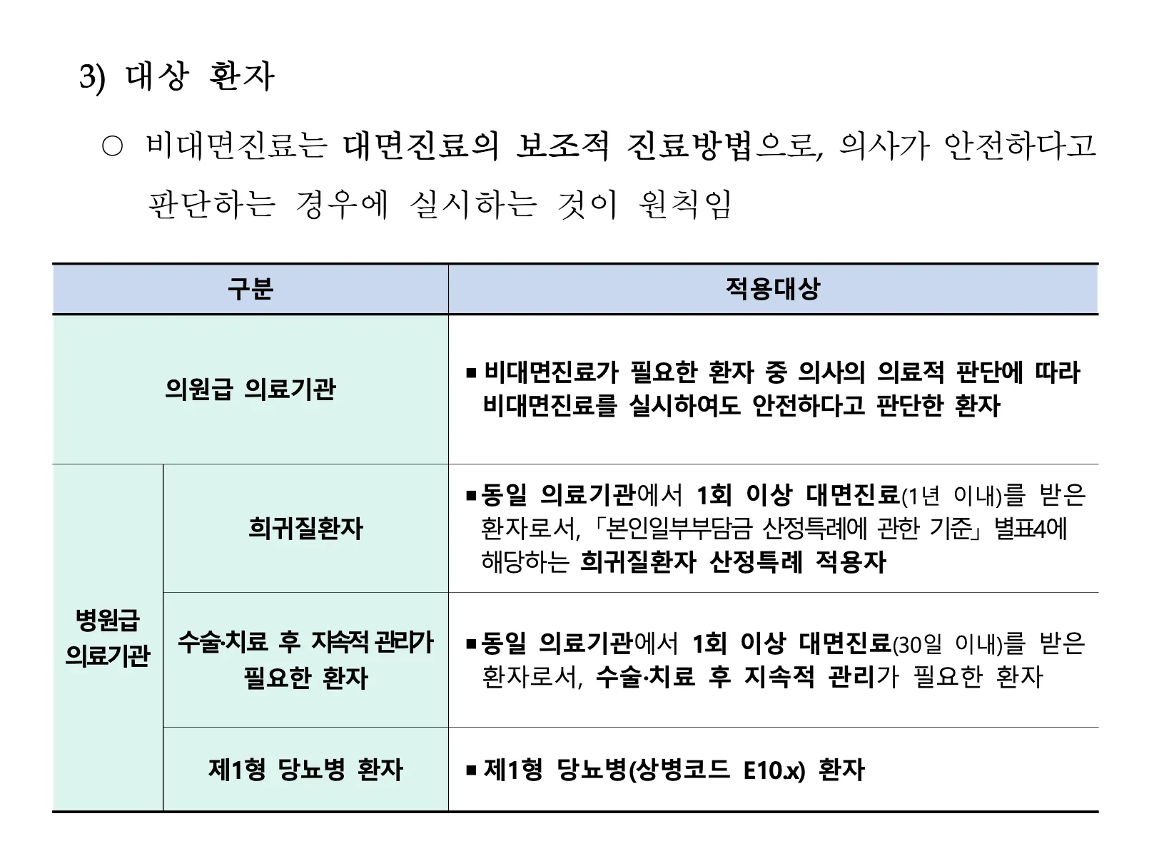 병원급은 희귀질환자, 제1형 당뇨 환자, 수술 및 관리가 필요한 환자만 비대면 진료 가능