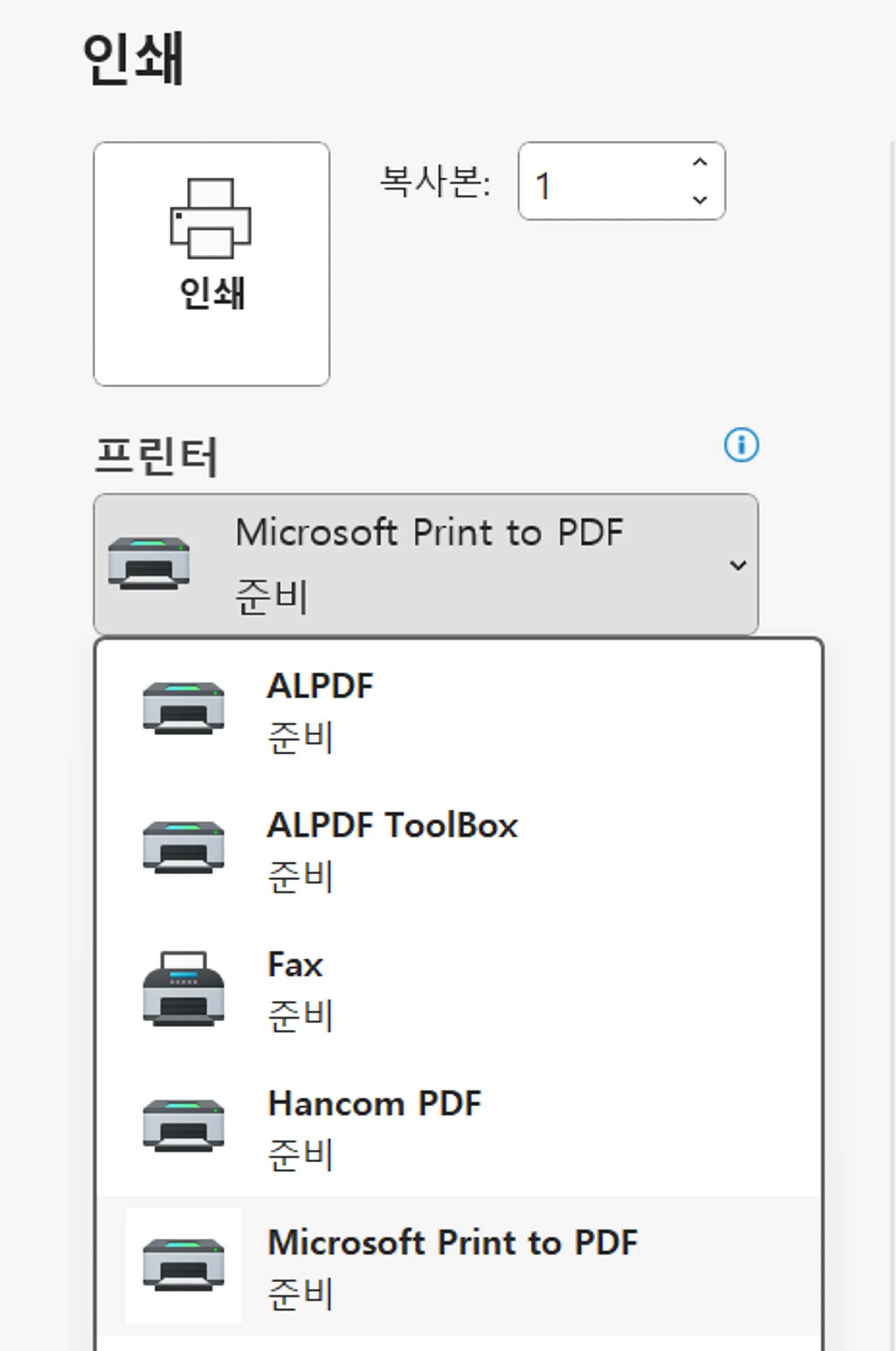 (Microsoft print to PDF는 기본적으로 제공 되며, 한컴, 알툴 등의 다수 앱에서 지원합니다.)