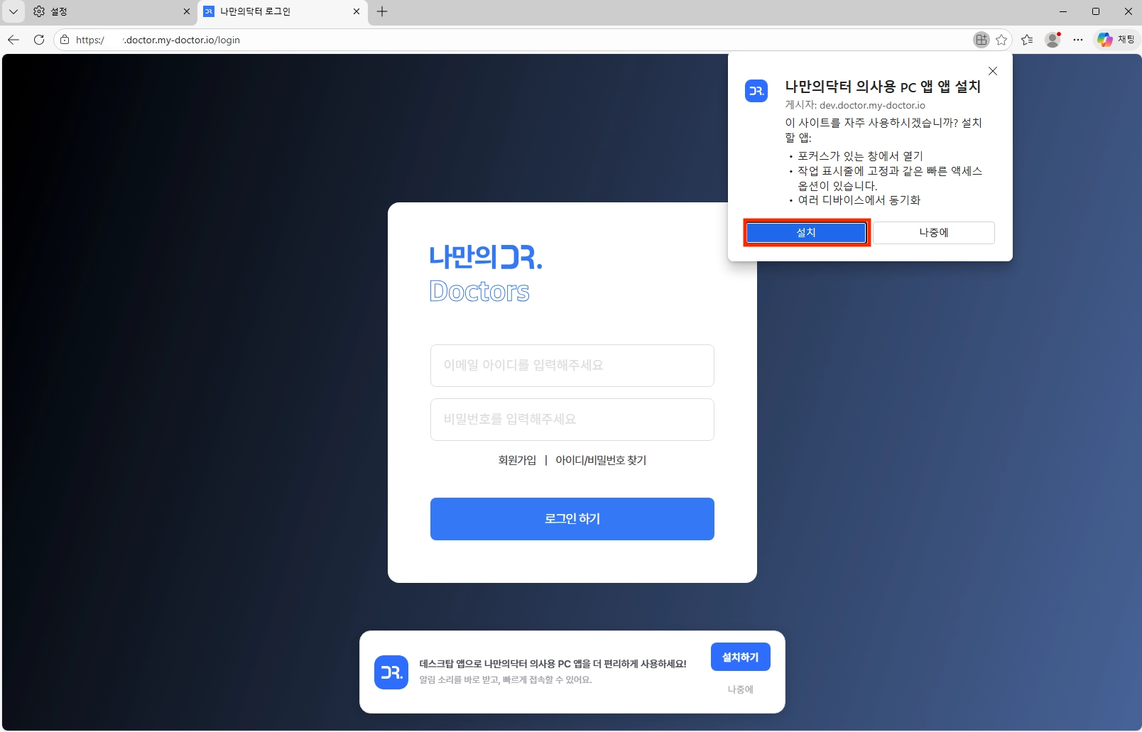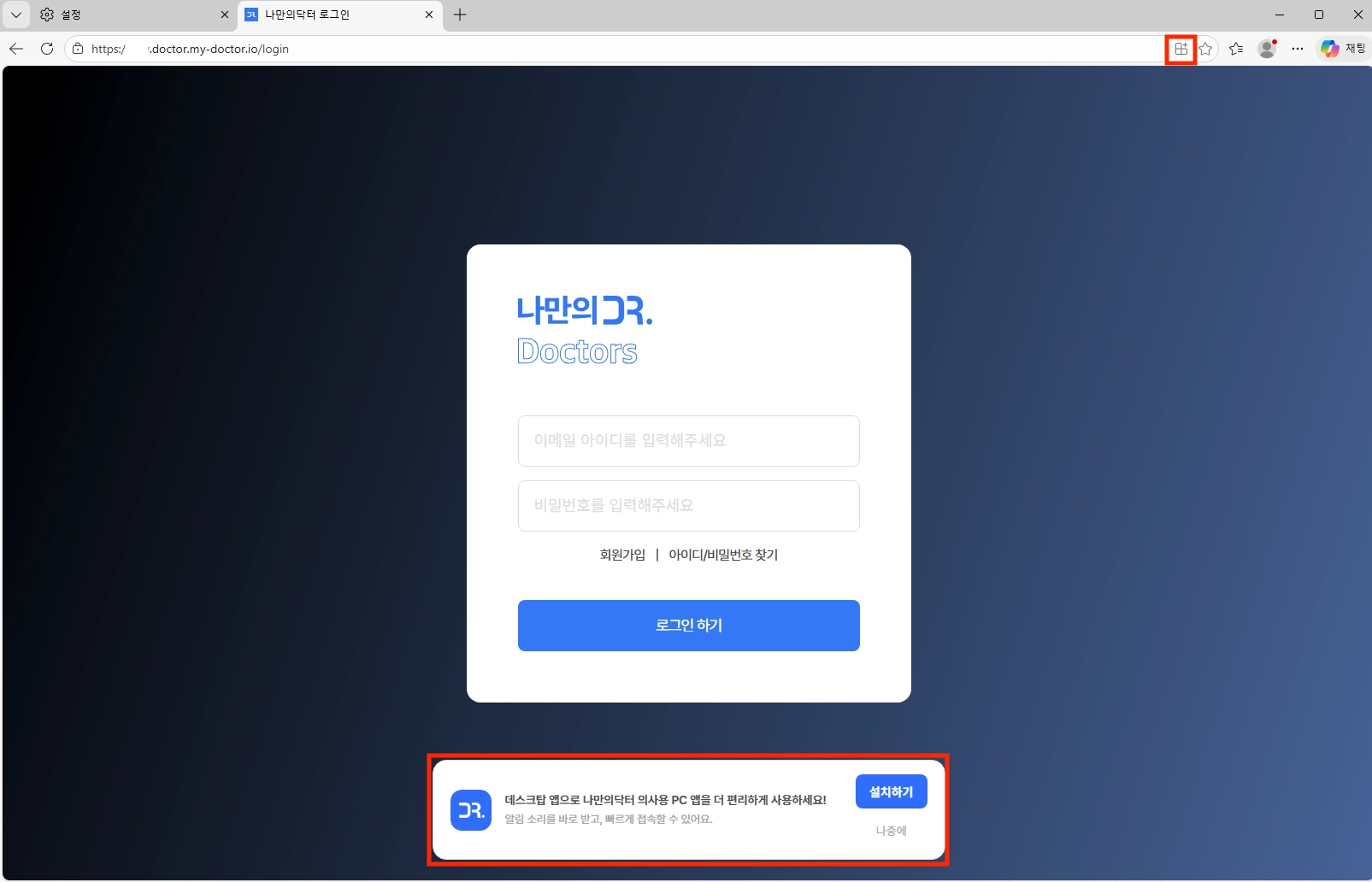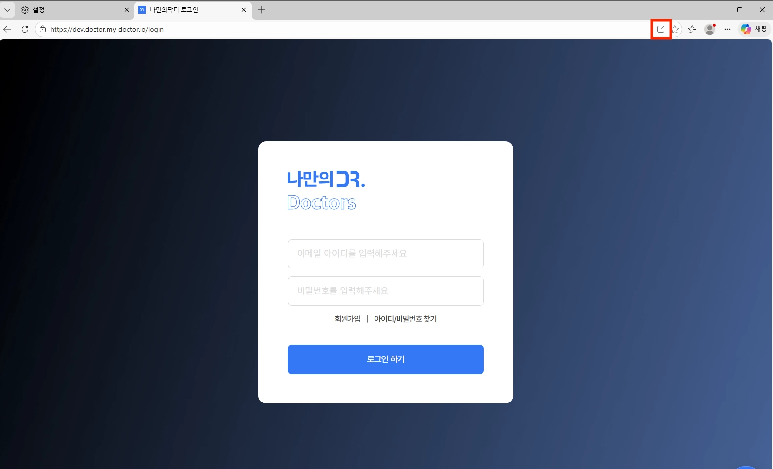 나만의닥터 의사 어드민 사이트 주소창 오른쪽에 앱 열기 아이콘을 클릭하여 앱을 실행할 수 있어요.
