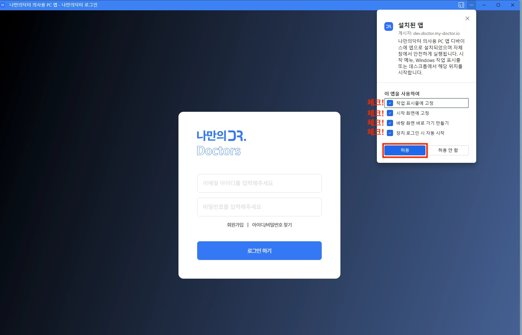 컴퓨터 전원 시작시 나만의닥터 의사용 PC 앱이 자동으로 시작될 수 있게 자동 시작을 허용해주세요.