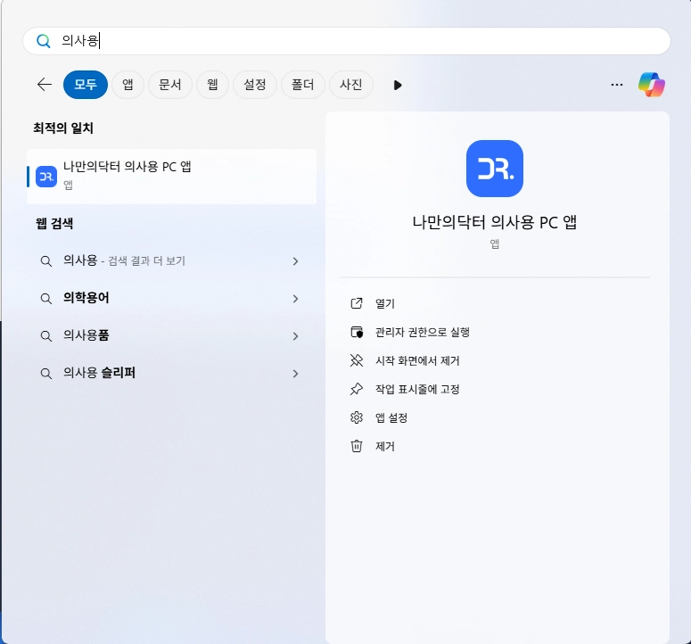 시작 메뉴에서 "나만의닥터 의사용 PC 앱"을 검색해서 클릭해주세요.
