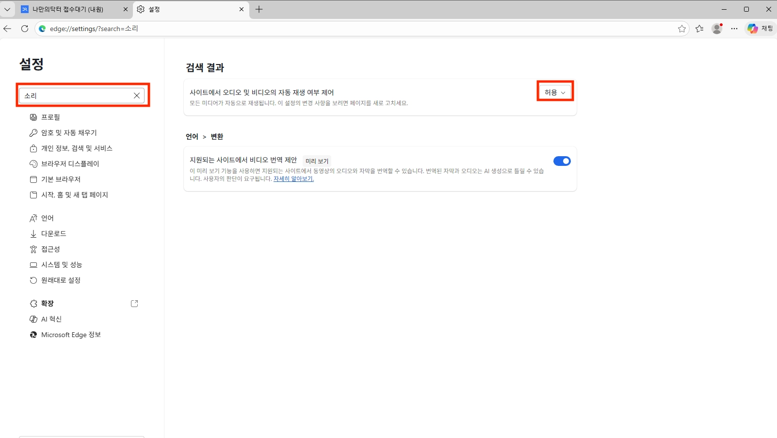 해당 설정 페이지에서 "소리" 또는 "사이트에서 오디오 및 비디오 자동 재생 여부 제어"를 검색하여 "사이트에서 오디오 및 비디오 자동 재생 여부 제어" 항목을 찾아주세요.