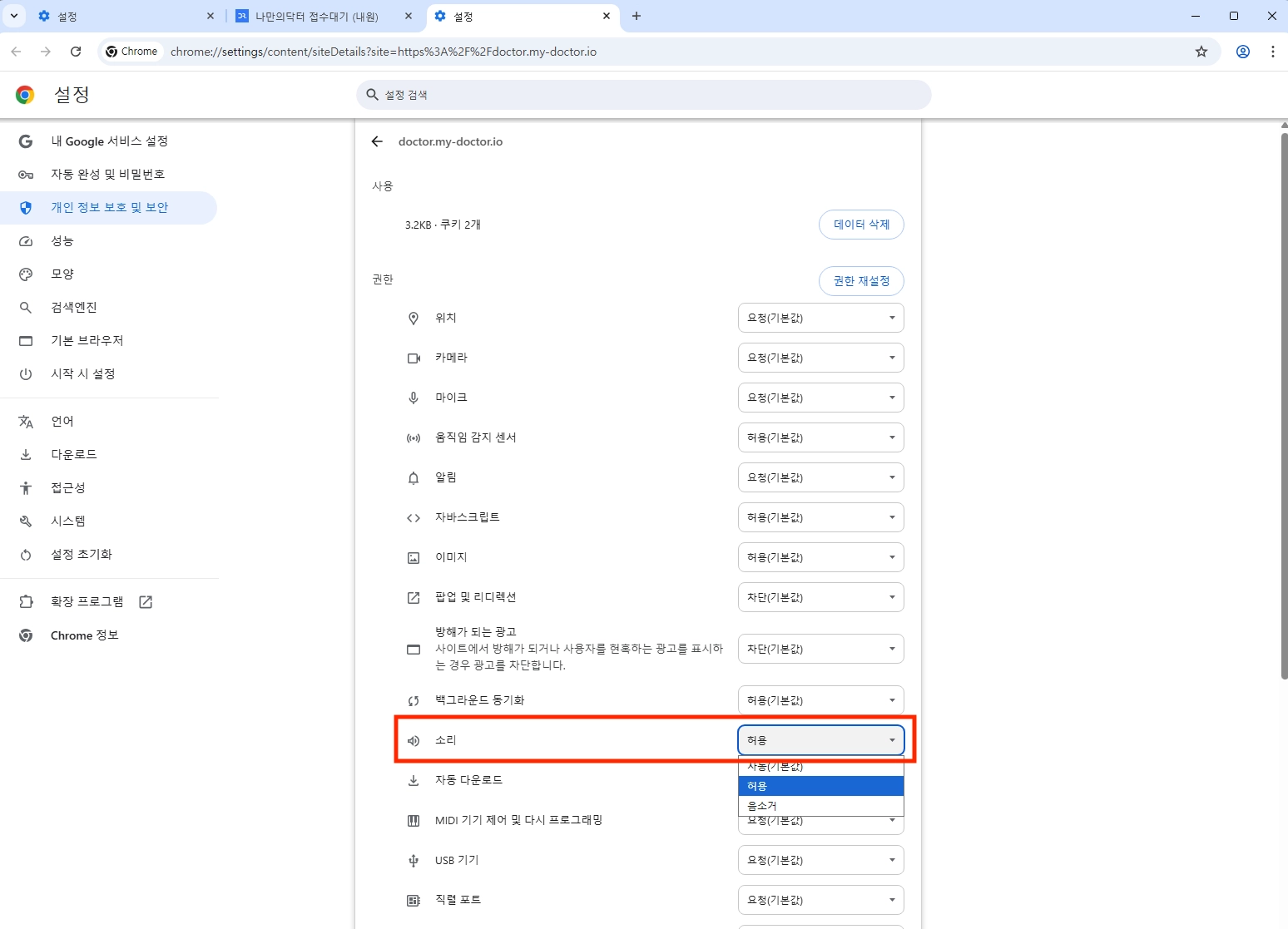 주소창에 edge://settings/privacy/sitePermissions/allSites/siteDetails?site=https://doctor.my-doctor.io 를 직접 입력하여 이동할 수 있습니다.