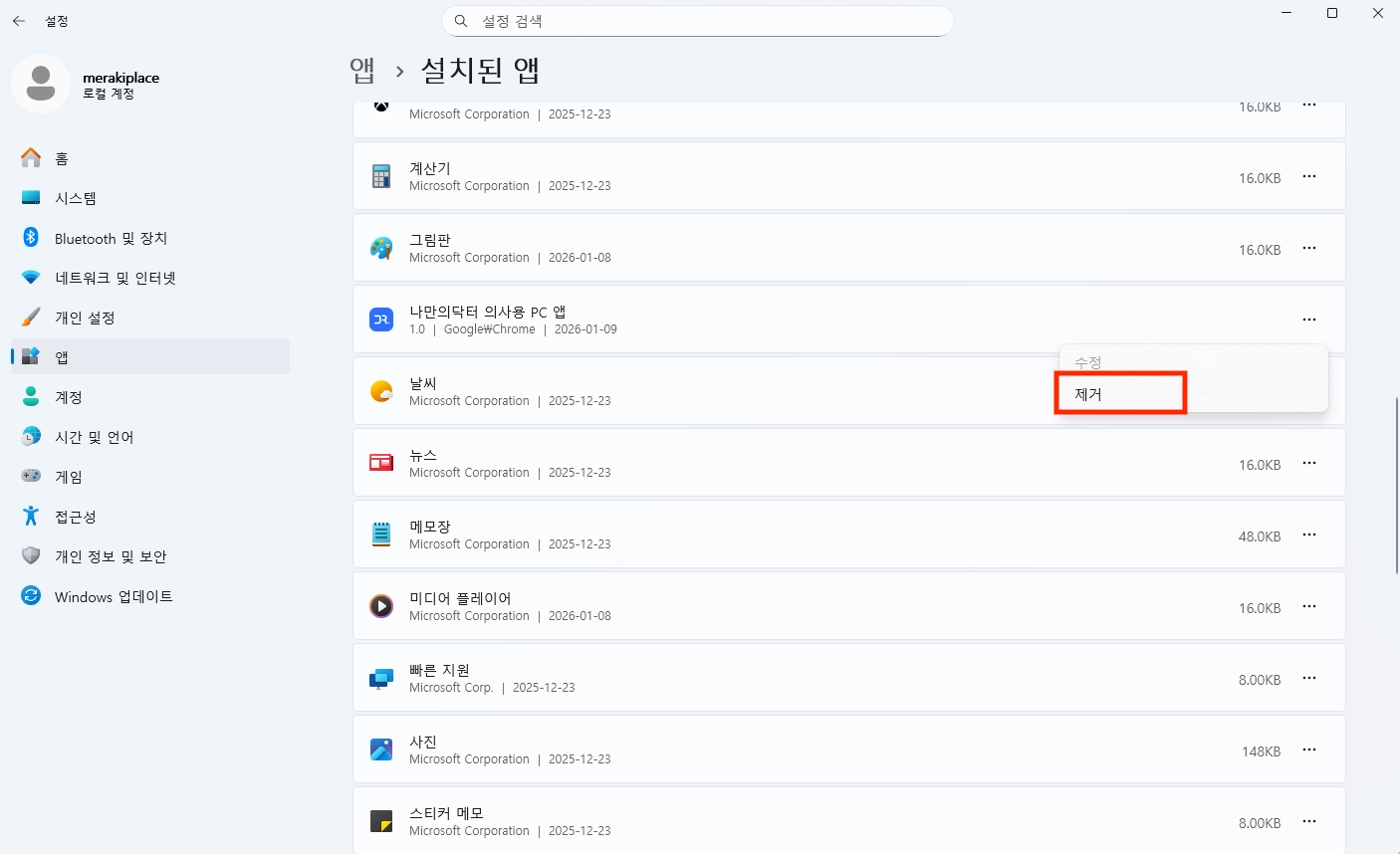 Windows: 설정 → 앱 → 설치된 앱 → "나만의닥터 의사용 PC 앱" 삭제