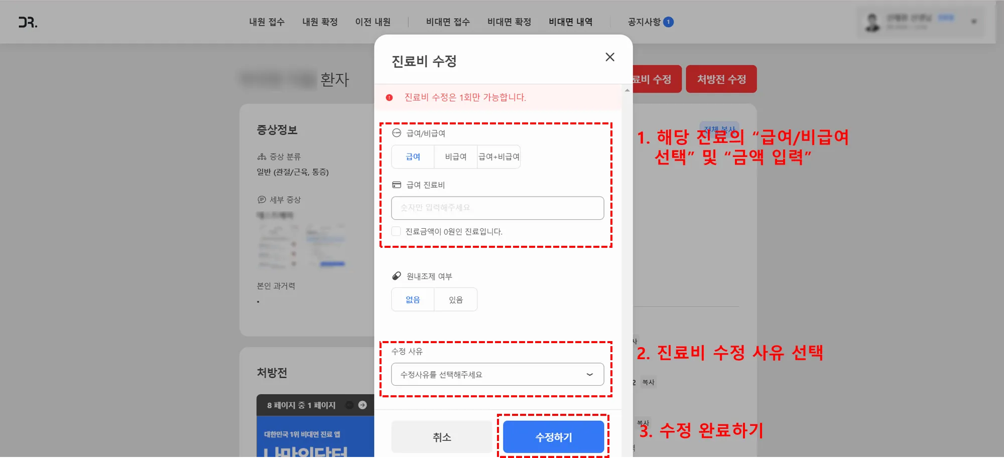 <급여/비급여 여부 선택 및 진료비 금액 입력, 수정 사유 입력, 수정하기 클릭하여 완료>
