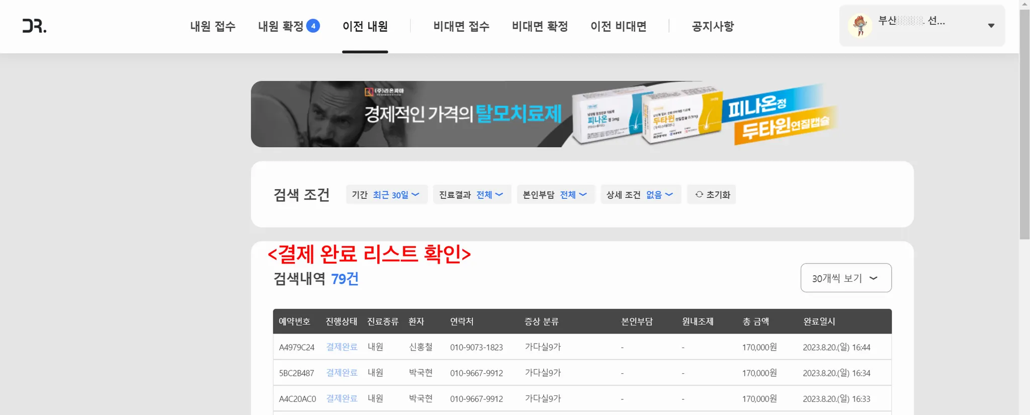 결제 완료 후 [이전 내원] 탭에서 결제 완료를 확인하시고
