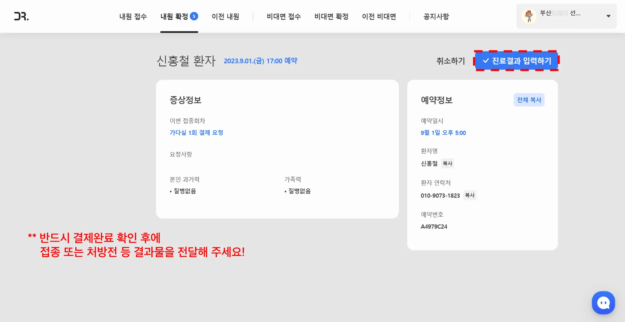‘진료결과 입력하기’를 통해 결제를 완료해 주세요.
